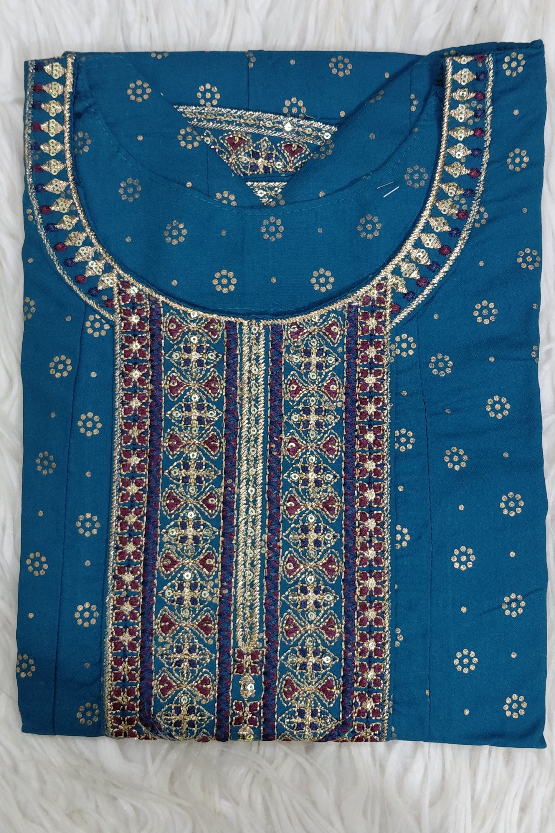 A stunning purple dress featuring intricate floral embroidery along the neckline and hem, perfect for festive occasions.
